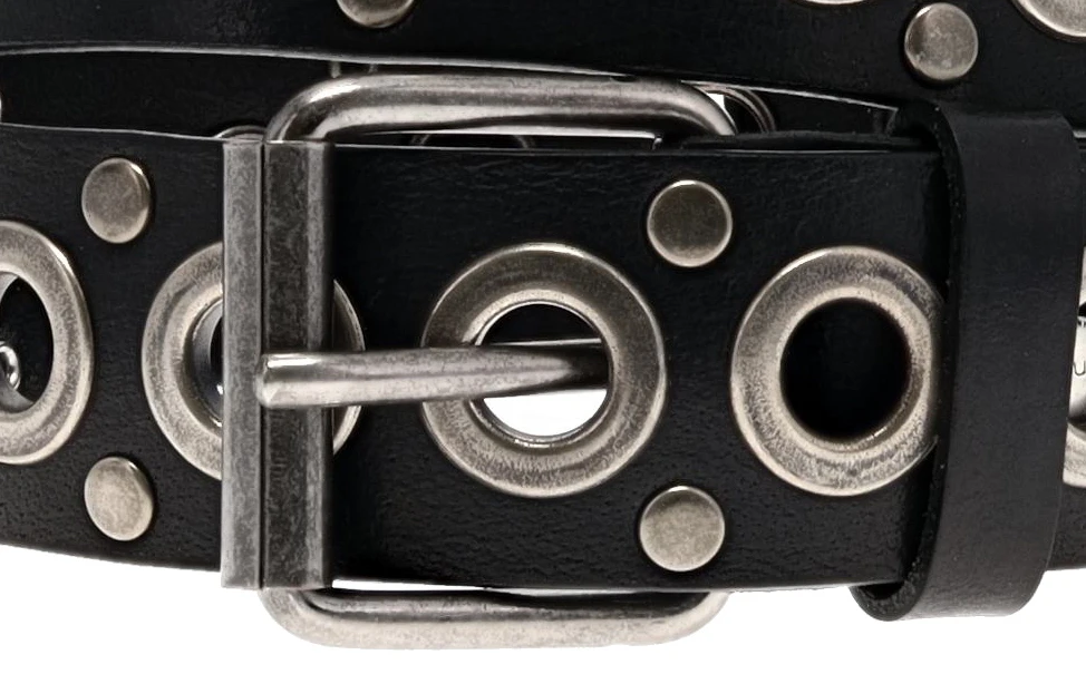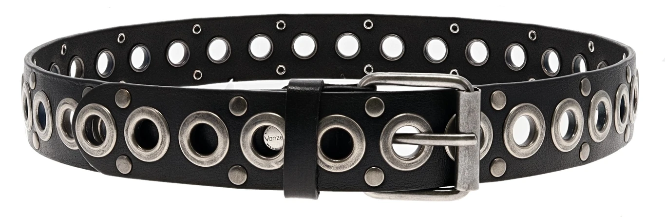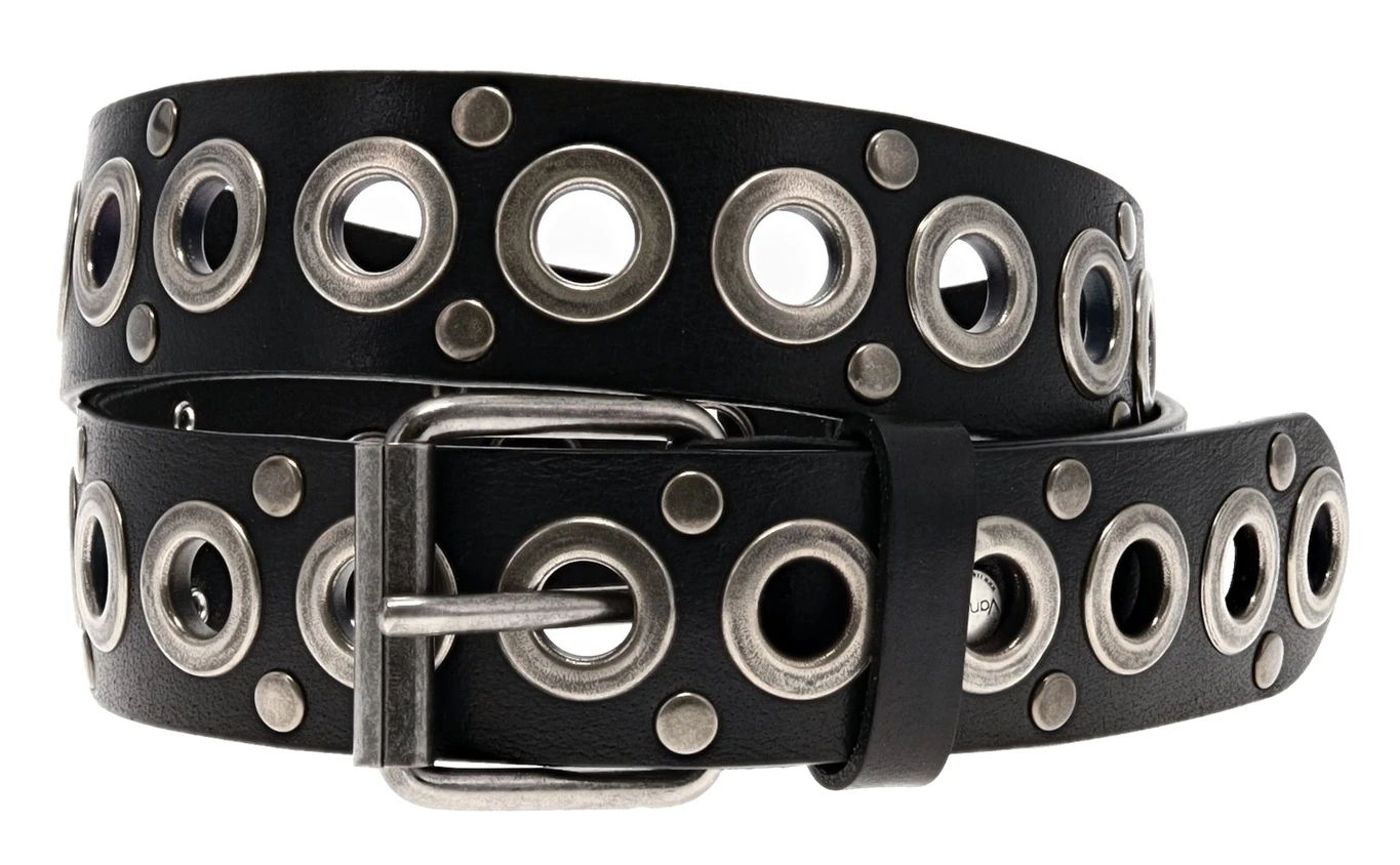 Top Modische Herren Ledergürtel aus Nieten, Ösen und Schließe in geschwärztem Silber. Made in Germany.